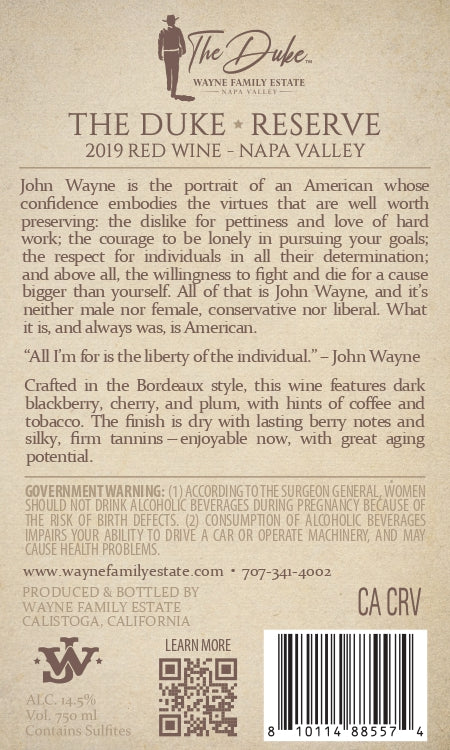 We introduce you to The Duke. Crafted in the Bordeaux style, this wine features dark blackberry, cherry, and plum, with hints of coffee and tobacco. The finish is dry with lasting berry notes and silky, firm tannins - enjoyable now, with great aging potential.