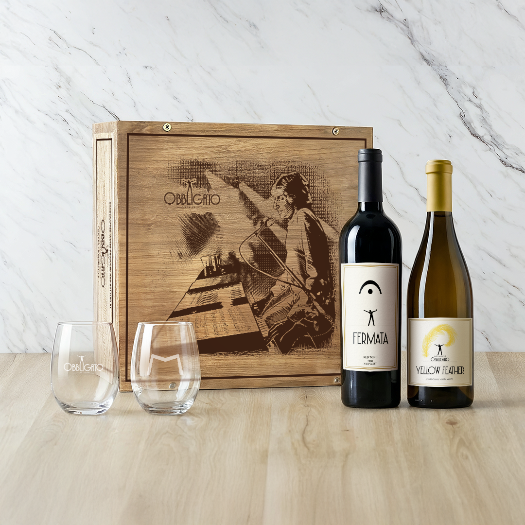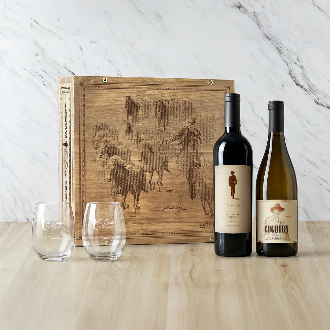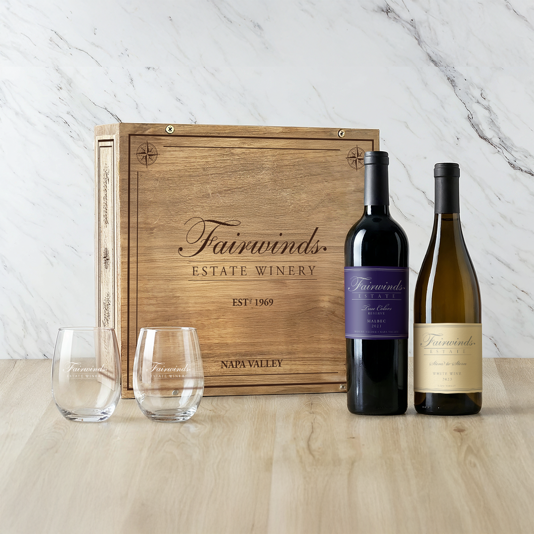 Indulge in a red & white wine experience, complete with a set of 2 stemless wine glasses, all dressed up in our fire-branded, 3-bottle wooden wine crate.