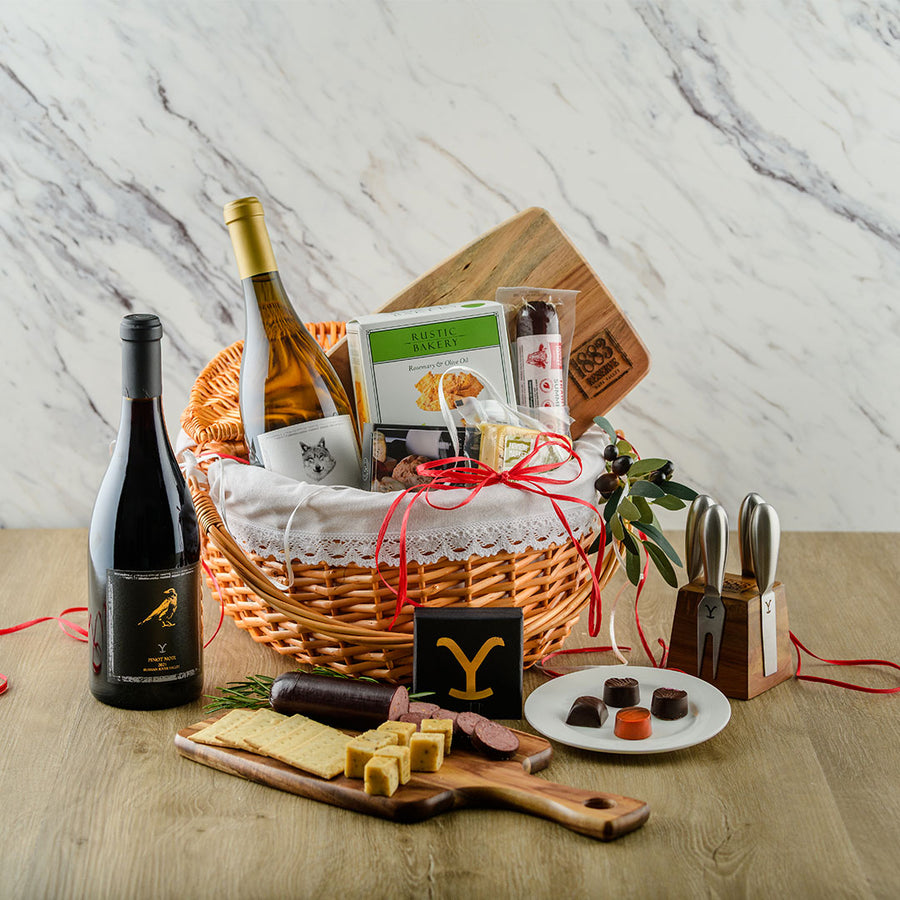 Invite a friend, find a shady spot and toast to good times with our premium picnic basket, filled to the brim with delicious bites, acacia wood cheese board, cheese knives, an elegant Pinot Noir and Napa Valley Chardonnay.