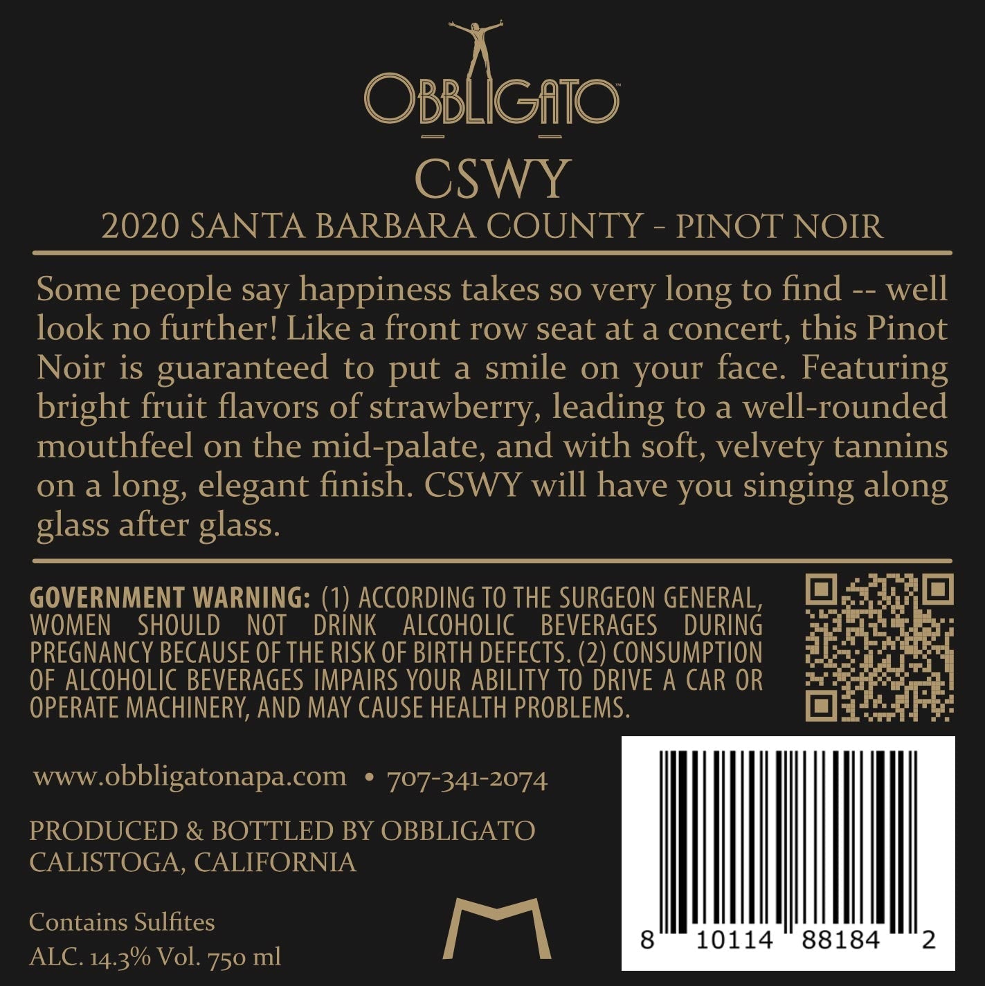 Some people say happiness takes so very long to find -- well look no further! Like a front row seat at a concert, this Pinot Noir is guaranteed to put a smile on your face. Featuring bright fruit flavors of strawberry, leading to a well-rounded mouthfeel on the mid-palate, and with soft, velvety tannins on a long, elegant finish. CSWY will have you singing along glass after glass.